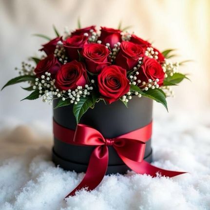 Arranged with 15 Red Roses, Baby Breath and Leaves Breath in a Round Box